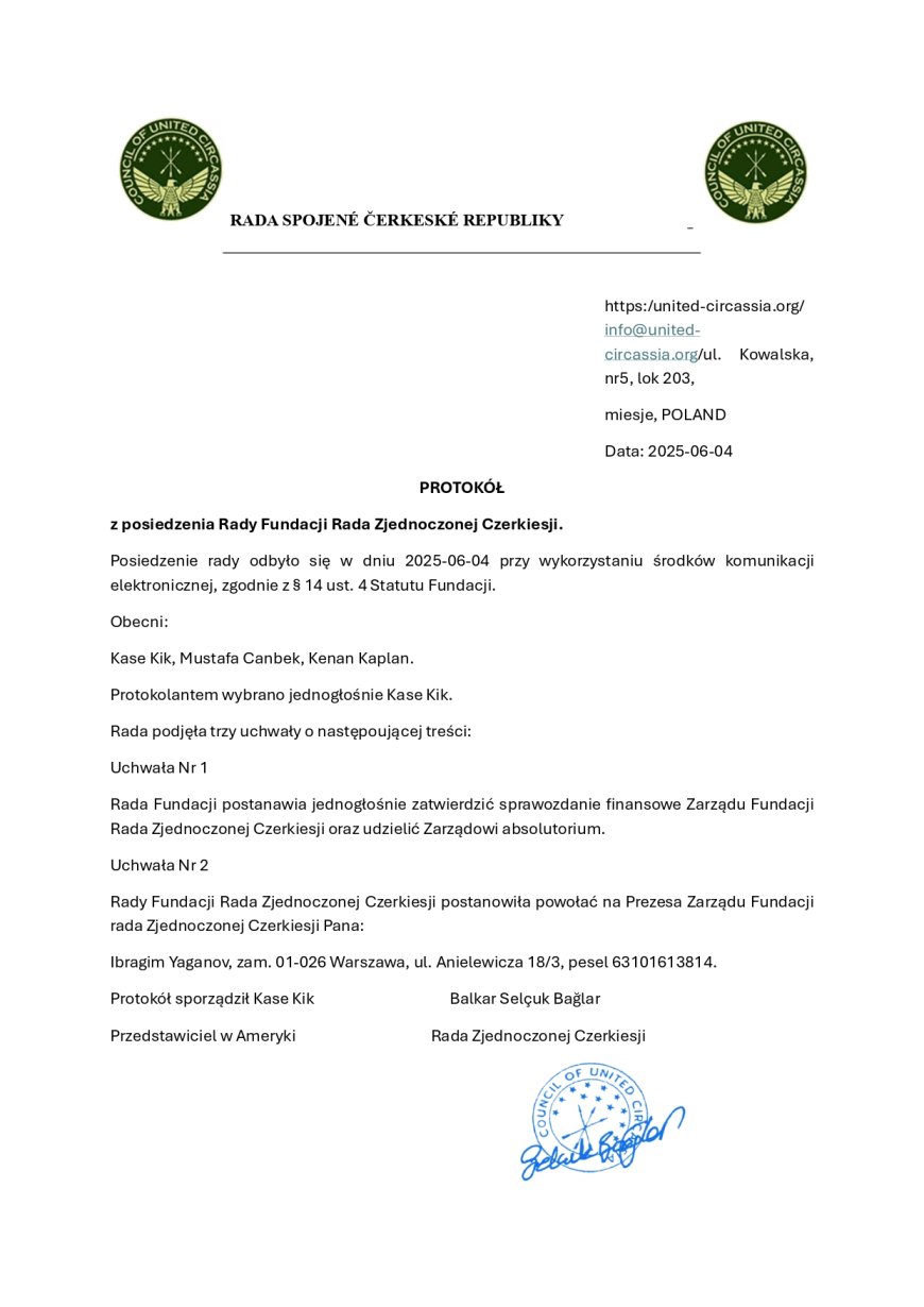 Hapiste tutuklu olduğum süre içinde avukatım üzerinden Genel Sekreterimiz Sn. Rüstem Huvaj Bey’i “Vekil Başkan” olarak yetkilendirmiş ve resmî olarak Yetki Belgesini mühürleyip imzalayarak kendisine ulaştırmıştım. Ancak Konseyin içindeki değerli yoldaşlarımız çoktan fiili bir durum yaratarak asla Birleşik Çerkesya Konseyi başkanı olmaması gereken Sn. Kasey Kik’i güya başkan seçtiklerini ilan etmişlerdir.