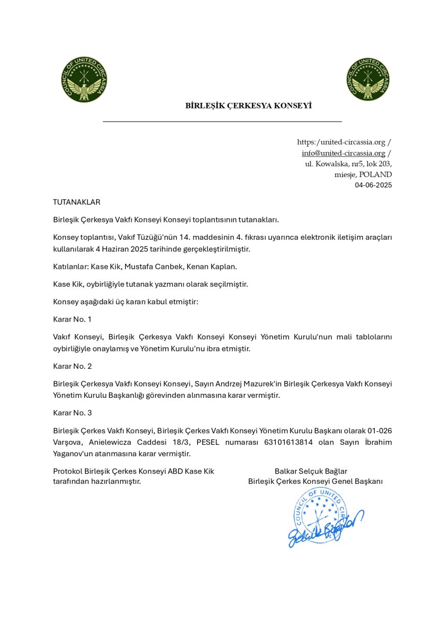 2- Sn. Mustafa Canbek’in de Birleşik Çerkesya Konseyi ile hiçbir alakası bulunmamaktadır. Daha önce Konseyden iki kez kendi rızasıyla ayrılmıştır. Onurlu bir insanın hareket etmesi gerektiği gibi Konseyin dışında kalmaya devam etmelidir. Fiilen elinde bulundurduğu konseyin internet ve X hesapları başkanlığıma derhal teslim edilmelidir. Kendisi, mensubu olduğu Çerkes halkına olan borcunu ödemek istiyor ise Birleşik Çerkesya Konseyi’nin politikalarına destek olabilir ya da bazı görüşmelere bireysel katkıda bulunabilir. Ama asla Konsey bünyesine bir daha dahil olamaz.
