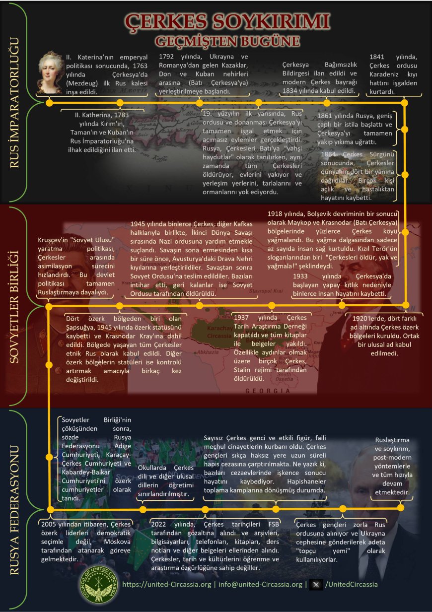 1864'te Rus İmparatorluğu, Çerkeslere karşı son bir sefer başlattı ve bu sefer birçok Çerkes'in öldürülmesi ve sürgüne gönderilmesiyle sonuçlandı. Rus kuvvetleri Çerkesleri ata topraklarını terk etmeye zorlamak için Çerkes köylerini yaktı, ekinleri yok etti ve su kuyularını zehirledi.